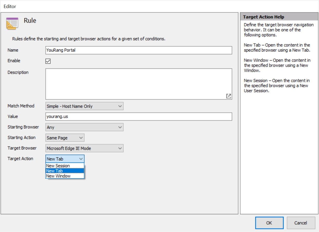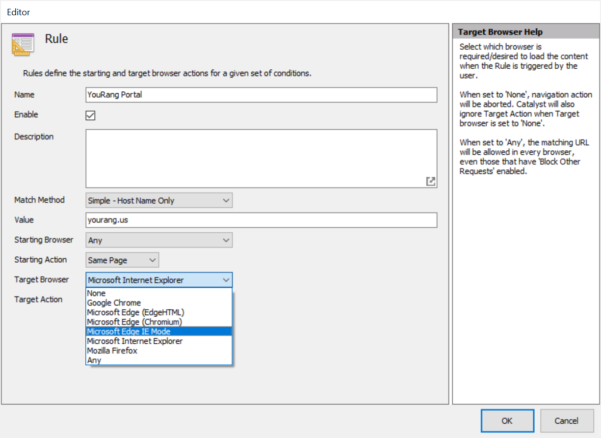 - The ‘Target Browser’ setting defines which browser is loaded when the rule conditions are met. By default, this value is set to the Default Browser value listed in the Project Settings node — in this case ‘Edge IE Mode’. Administrators should set this value to the desired browser. If the purpose of the rule is to block navigation (e.g. for security purposes), simply set the value to ‘NONE’. For this example, we will load the YouRang portal in Edge Internet Explorer Mode.