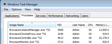 - After the test configuration has been started, you may want to confirm that the Browsium Client processes are all running by viewing them in the Task Manager. The key processes are BrowsiumController.exe and BrowsiumMonitor.exe. Those will only run when the Controller is running with a valid Catalyst configuration (or a valid Proton or Ion configuration, as all three modules share a single Browsium Controller).