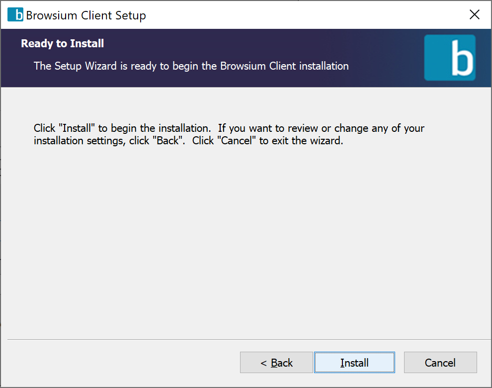 - Browsium Client is now ready to install. Click Install to proceed.
