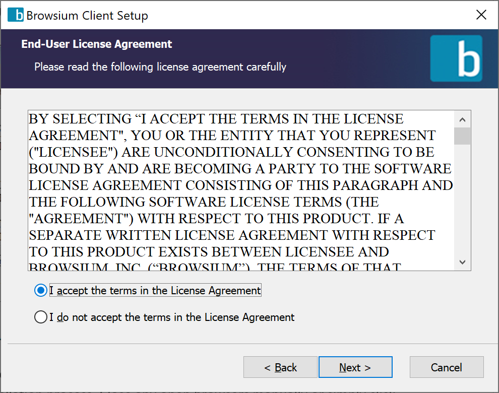 The next screen contains the End User License Agreement (EULA) for Browsium software. Read and accept the terms of the EULA in order to proceed, then click Next.