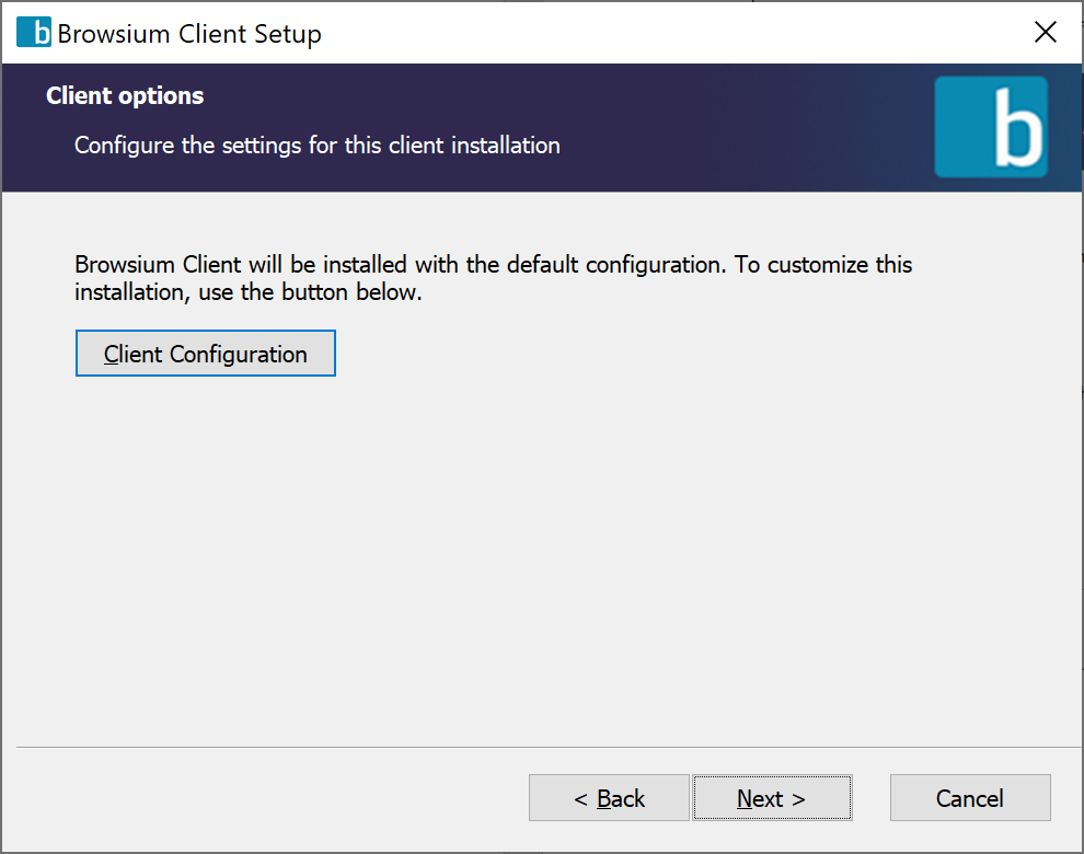 Section titled “Installation”This section covers manual installation of Browsium Client. Network and command line installation options can be found in Command Line Switches for the Browsium Client Installer. Administrator rights are required to run the Client Installer. Once installed, the Browsium Client runs under any user account and does not require special user permissions or elevation.
