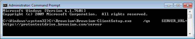 Open Command Prompt as Administrator, enter the path to Browsium-ClientSetup.exe (located in C:\Browsium in this example), add the /qn switch, and substitute the SERVER_URL value with your FQDN/server. Include :<your server port> before /server if using any port other than 443.