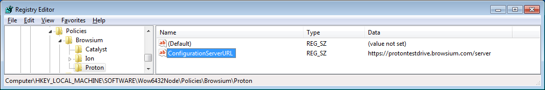To activate Browsium Client later, populate the appropriate registry key location and value. The Proton service will activate automatically when Browsium Controller starts (at reboot or user logoff/logon) and detects a ConfigurationServerURL value in the registry.