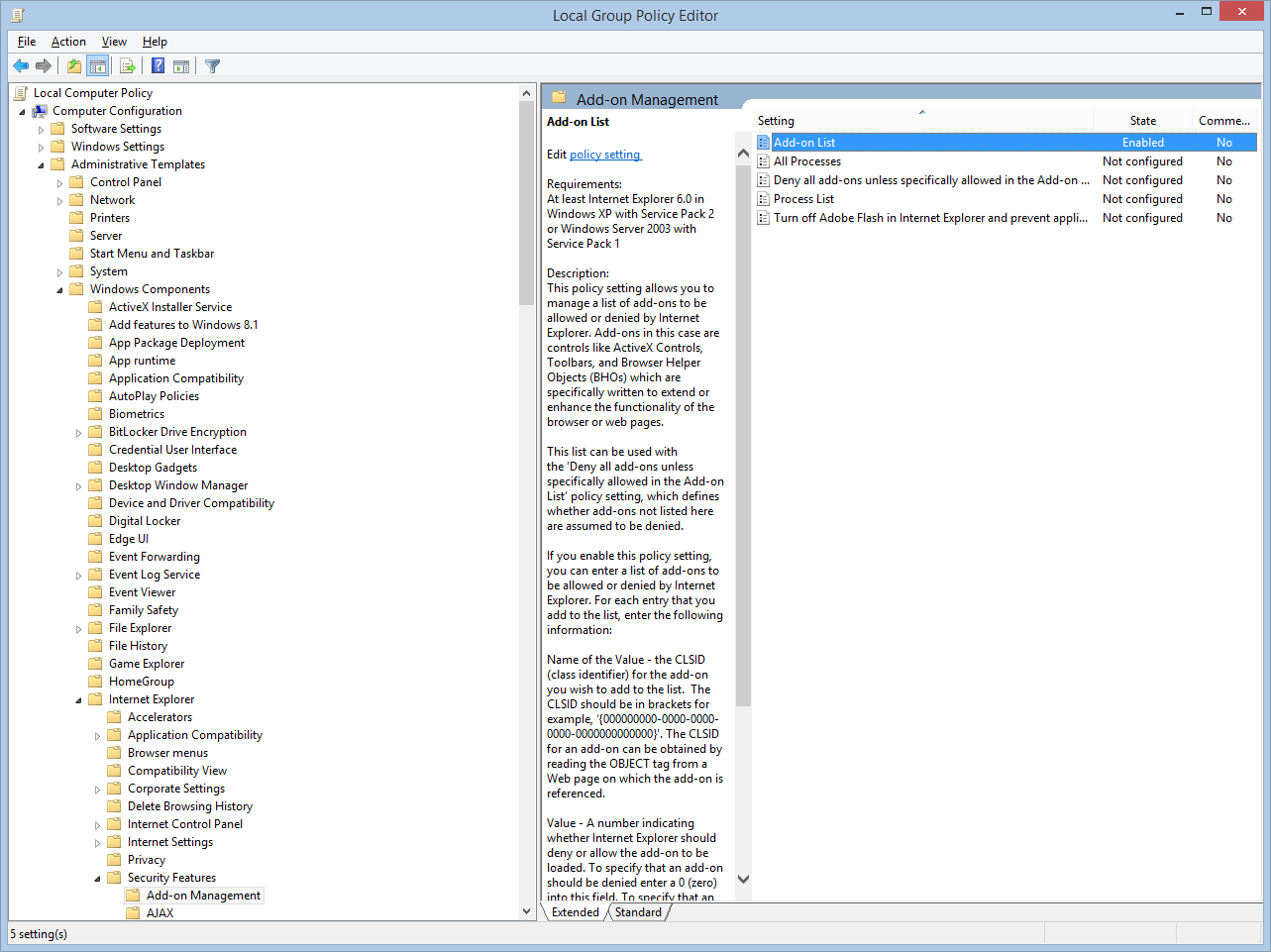 Path: User Configuration or Computer Configuration node; Administrative Templates\Windows Components\Internet Explorer\Security Features\Add-on Management. To set this policy, an administrator can enable the policy and enter the GUID/CLSID of the Browsium extension to the Add-on List and set the value to 1.