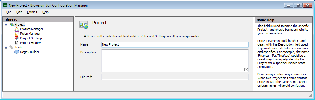 Project details (Name and Description) can be edited on this screen. Projects are assigned a default name and a blank description and should be edited to reflect information and labeling relevant to your organization. The project’s File Path is blank until you save the project file. This field cannot be edited but will be updated automatically if the project is saved to a new location.