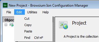 The Edit menu provides Cut, Copy, and Paste functions to assist in project editing and moving rules and Profiles between projects. These functions are also available in the Actions pane for many of the Managers for easy access. The Edit menu also has a Find function (available from the menu or via Control-F) which searches for specific strings inside the project.