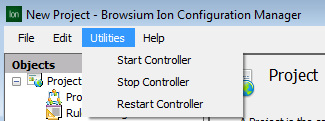 You can use the Utilities menu to manage the Browsium Controller (BrowsiumController.exe) process. You may need to Start/Stop/Restart the Browsium Controller to load new configurations or reproduce troubleshooting steps.