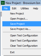The first menu you will interact with is the File menu. It contains the typical functions to create a New Project, Open Project (a .BCX file on disk), and Save Project (or Save Project As) to a .BCX file. It also has three special functions to Open/Start/Clear Test Configuration which require more detailed explanations.