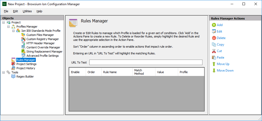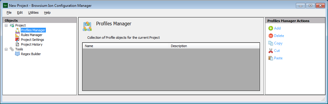 The Actions Pane includes the Delete, Copy, Cut, Paste items which are helpful when working on a project populated with several Profiles. The Copy, Cut and Paste items integrate with the system clipboard and are especially useful when working with multiple Ion Configuration Manager instances loaded with unique project files.