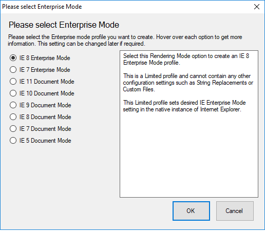 Enterprise Mode Profiles are ‘limited’, in that no other browser settings can be modified or managed. For example, no Java management is possible with an Enterprise Mode Profile selection.