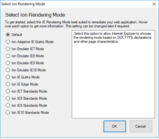 Section titled “Standard Ion Profiles”Standard Ion Profiles are the most flexible and powerful type of Profile available. To being, select the Rendering Mode that most Rendering modes are a collection of settings, anchored by Internet Explorer Document Modes, designed to provide maximum backward compatibility for business applications that require legacy versions of Internet Explorer. This screen shows the available rendering mode templates: