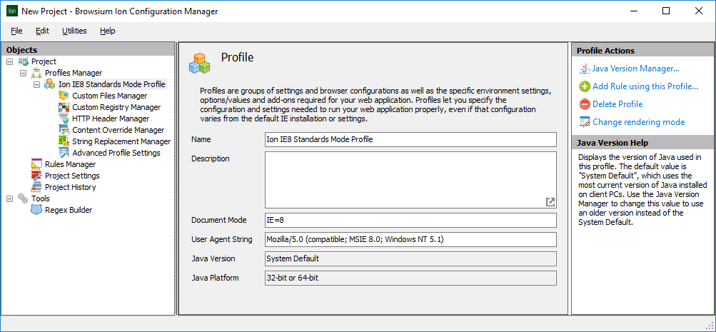 Any Profile can be modified to suit specific web application compatibility issues. For example, Ion makes it possible to specify different versions of the Java Runtime Environment (JRE) on a per-Profile basis, whereas changing the JRE version for Internet Explorer globally would only allow for a single version to be loaded at a time.