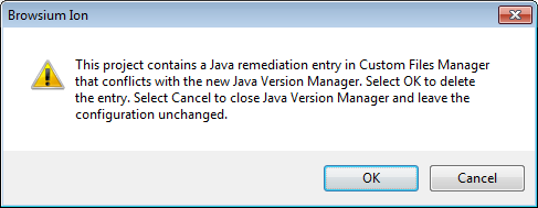 Running Java Version Manager in a project that contains a legacy Custom Files-based Java remediation will automatically delete the legacy Custom Files entry. You can then select the same version of Java from Java Version Manager to create the new remediation. You will see the following prompt before the Custom Files entry is deleted. Selecting Cancel will keep your legacy Custom Files entry unchanged. Browsium recommends selecting OK and deleting the legacy entry, followed by the Java version selection in Java Version Manager.
