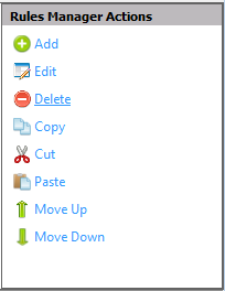 Cut - To cut a rule (which copies the item to the clipboard rather than delete it entirely), select the item from the Rules Manager window and click the Cut item in the Actions Pane.