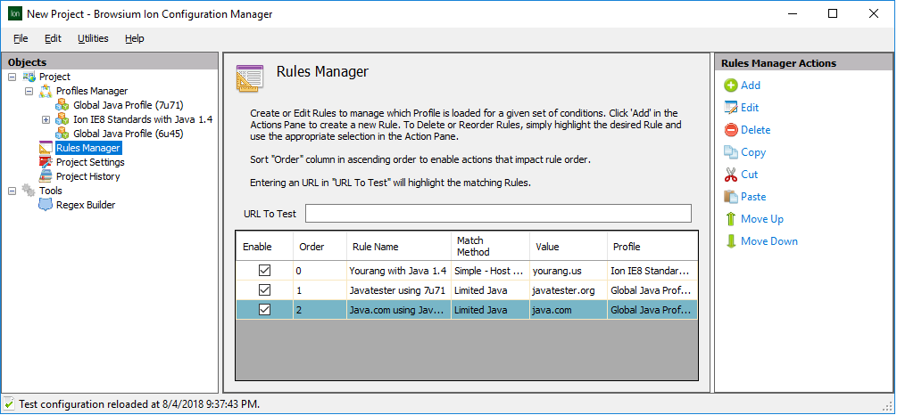 Move Rule Up/Move Rule Down - Rules are evaluated in the order they are stored, so the sequence of rules can be critical to the proper functionality of your web applications in Ion. By default, rules are ordered in the sequence they are added. You can override this default by selecting a rule in Rules Manager prior to adding a new one. The new rule will be added immediately below the selected rule. To manually adjust the order of a rule, simply highlight the rule and use the Move Up and Move Down actions to move it to the proper placement.