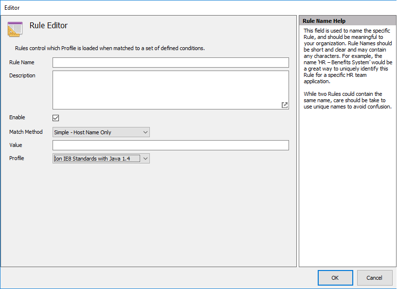 Rule Name — You can name a rule using any characters without restriction or character count limit. Rule names are for your use and identification only, and have no impact on functionality. Browsium recommends using rule names that clearly describe what the rule is used for, so it can be easily identified in the Rules Manager display.
