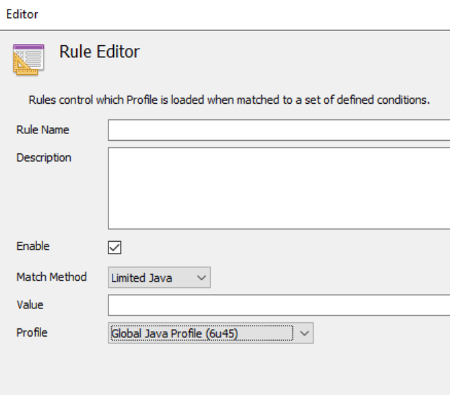 When creating a new Rule, the Match Method is not visible at first. A Profile must be selected before the Match Method dropdown will appear. If the Profile selected is a Global Java Profile, the Match Method dropdown will only display ‘Limited Java’ as there are no complex match operations available for Global Java Profiles.