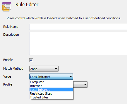 Value — This field contains the string to conditionally match for the selected Ion Profile to be invoked. If Match Method is set to Zone, the Value field will change to a dropdown menu containing Computer, Internet, Local Intranet, Restricted Sites, and Trusted Sites.