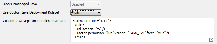 Use Custom Java Deployment Ruleset — Allows the creating and editing of a custom Java deployment ruleset XML file, per Oracle’s Deployment Ruleset (DRS) specification. Enabling this option will add a Custom Java Deployment Ruleset field to Project Settings, and preclude the use of the Block Unmanaged Java option and Global Java Profiles (as both are controlled from the single DRS file created by this setting). When ‘Use Custom Deployment Ruleset’ is enabled, ‘Block Unmanaged Java’ is disabled and grayed out, and Global Java Profiles do not appear in the list of rendering modes when creating a new Profile.