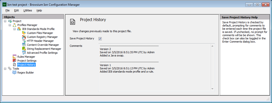 Section titled “Project History”Project History provides a simple interface to record comments when saving an Ion project. This feature is intended for project developers who want to keep a manual changelog for their Ion projects. It’s particularly helpful if multiple project developers are editing a single project file.