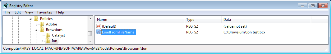 In this example, LoadFromFileName has been configured to use the file “Ion test.bcx” in the C:\Browsium directory on a 64-bit Windows system. These entries can be scripted and delivered to the Registry on remote clients via the following text in a .reg file.