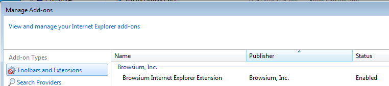 In Internet Explorer, open the Manage Add-Ons window, and check that the Browsium Internet Explorer Extension is enabled. Your configuration should match the configuration in the screenshot below: