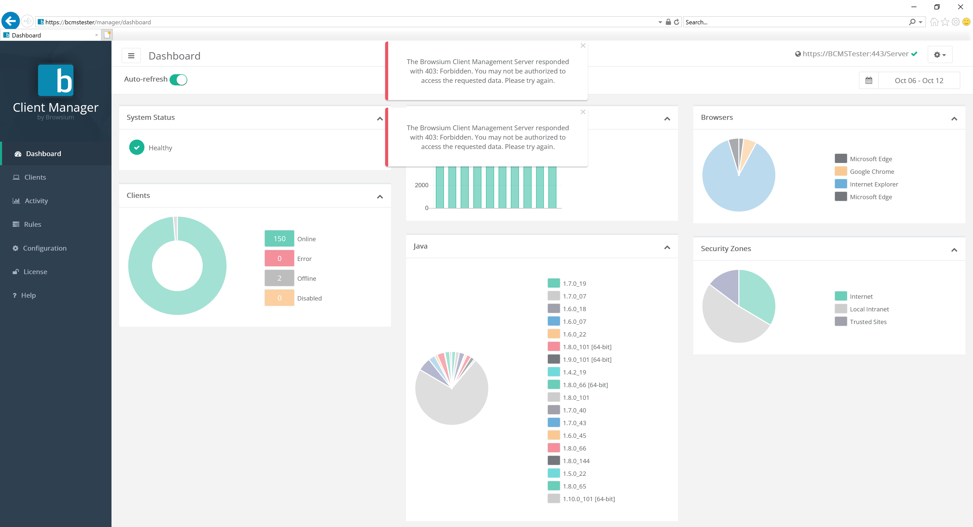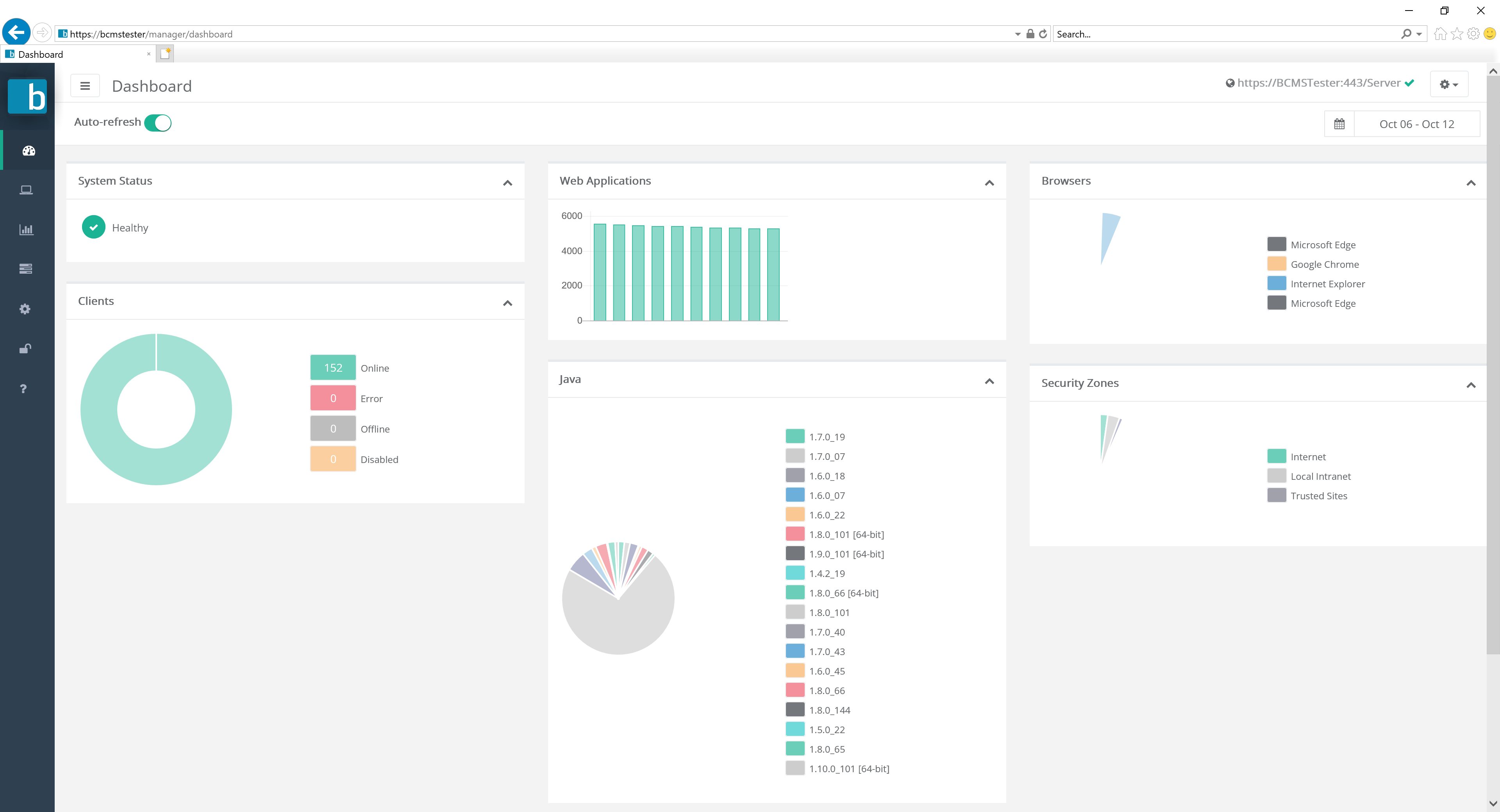 Section titled “Dashboard”The Browsium Client Manager’s default view is the dashboard, which provides a high-level view of the latest data collected by Proton clients in the organization. By default, the charts will update in real time so long as the ‘auto refresh’ option remains selected. There are 3 main elements to the default Dashboard view: the navigation ribbon on the left side, the controls bar along the top, and the chart view in the middle.