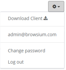 {width=“0.39291447944006996in” height=“0.272911198600175in”}) provides access to advanced features including downloading the Browsium Client, changing the password for the user currently logged into the Manager, and logging out of the Manager. Use Log out to connect to a different Proton server.