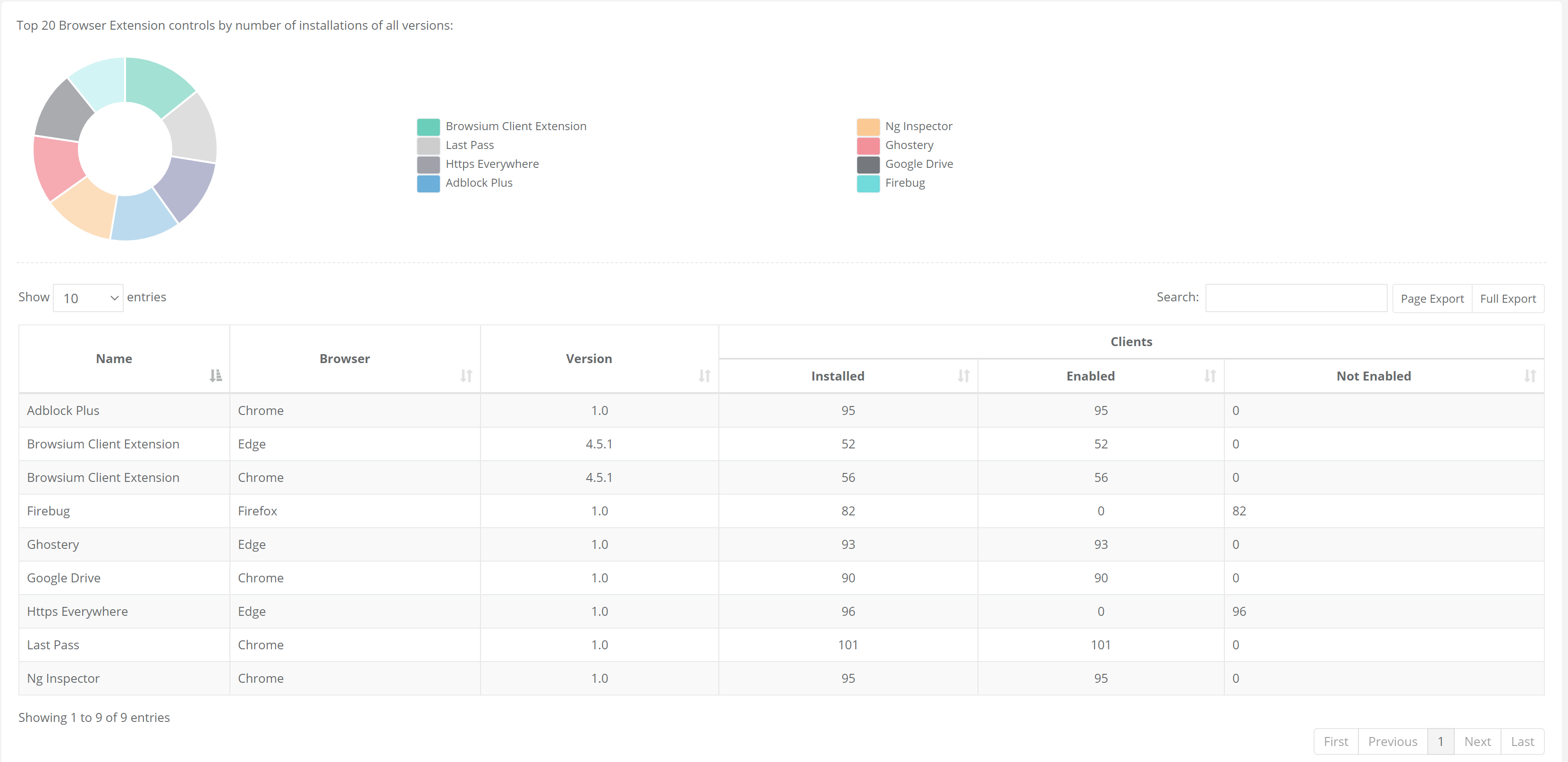 The table lists all browser extensions installed and version information, the browser with the extension installed, as well as a list of how many clients have that extension installed and enabled.