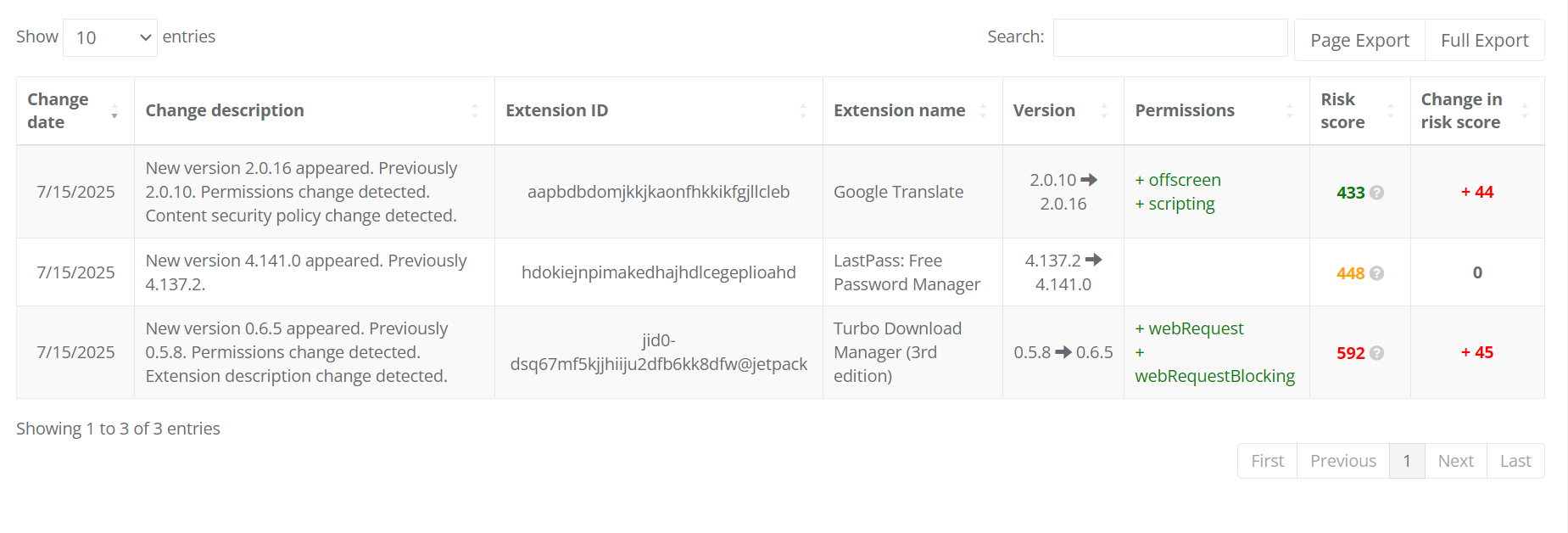 Section titled “Extension Updates”Extension Updates provides a full view of any changes to extensions from their previous version status. When an extension is updated (manually or using the auto-update mechanism) and the client data is reported to Proton, the system will perform a complete review of the new extension and manifest data. Proton will identify any changes in permissions and score the modifications based on the organization’s configuration criteria.