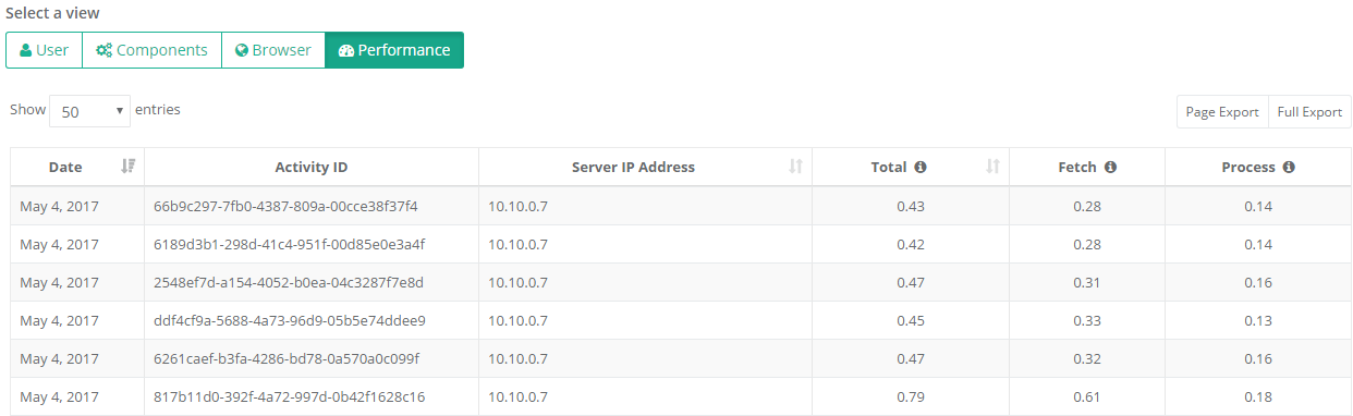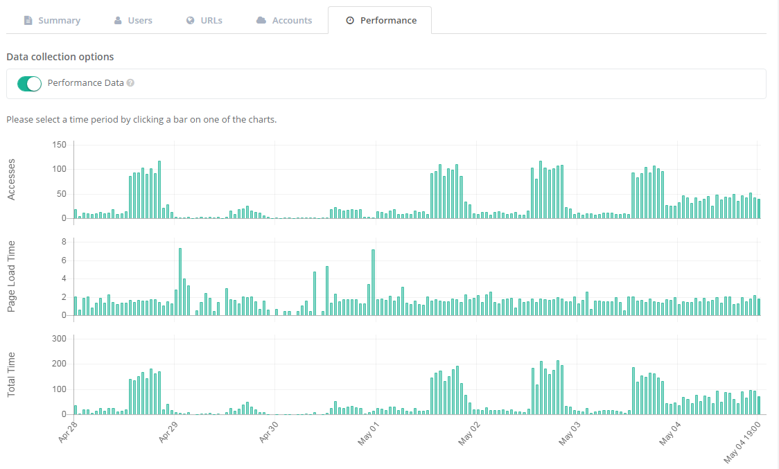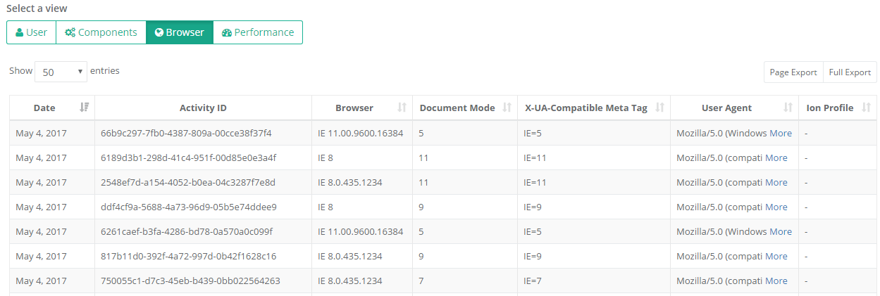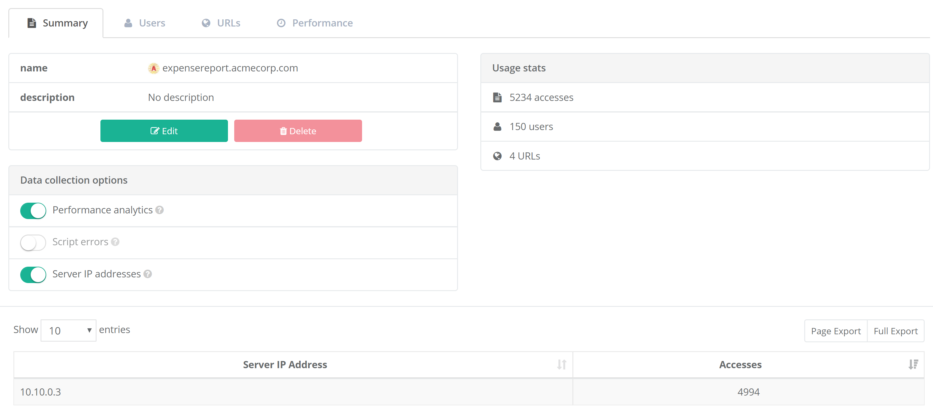 The first five, Java inventory, Java usage, ActiveX inventory, ActiveX usage, and Browser extension inventory, are globally controlled, either on or off for all clients and web applications. The last four, performance analytics, server IP addresses, script errors and Query strings, have a global control with more granular control per web application. When enabled on the Configuration page, performance analytics and server IP address data collection defaults to enabled for each new web application. However, script errors and user accounts work differently.