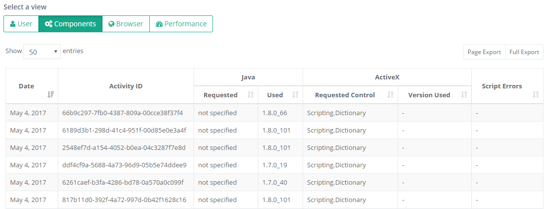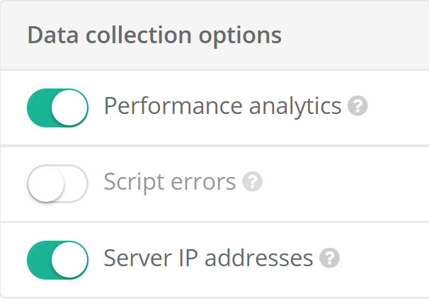 Section titled “Data Collection Options”Data Collection Options provide the ability to control what data is collected from client systems. This provides the ability to turn on or off the collection of Java inventory (versions installed), Java usage details, ActiveX inventory (controls and versions installed), ActiveX usage details, Browser extension inventory, page load performance metrics, server IP addresses, and script errors. All options are enabled by default.