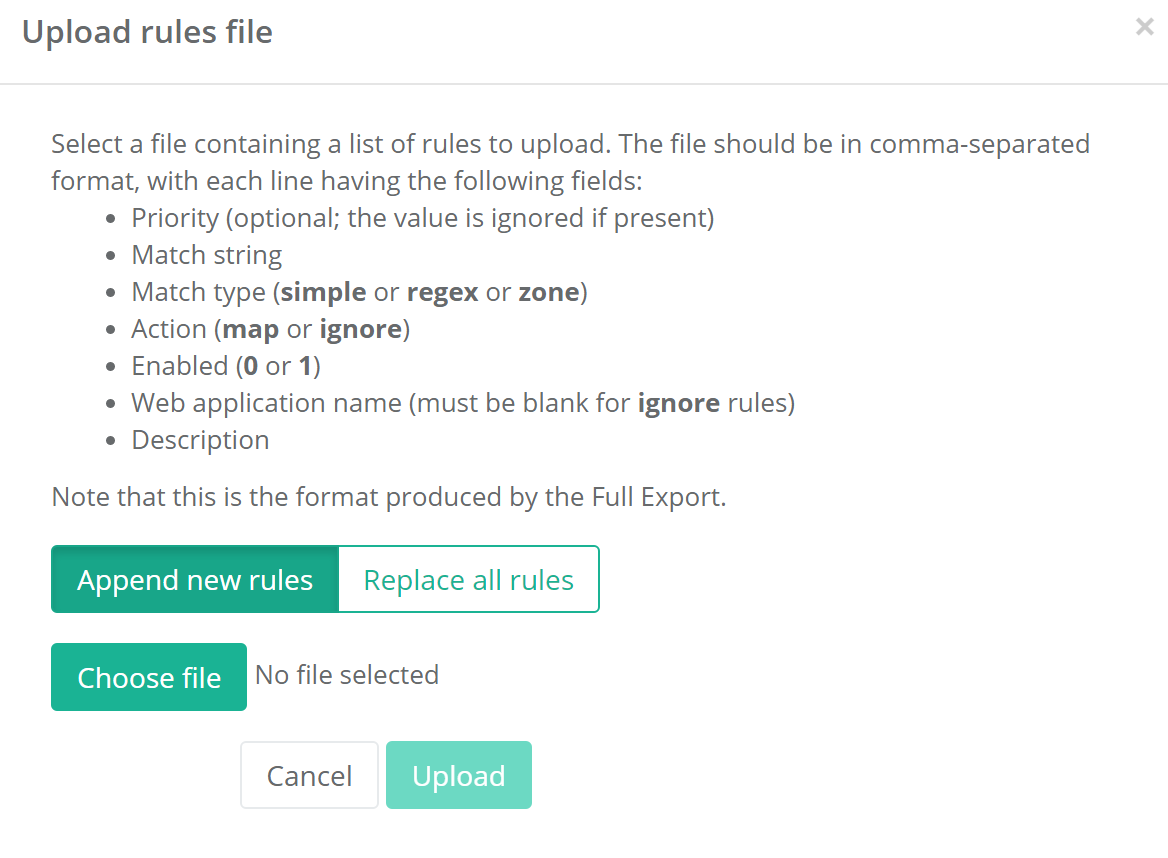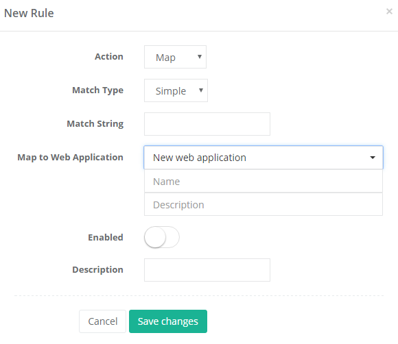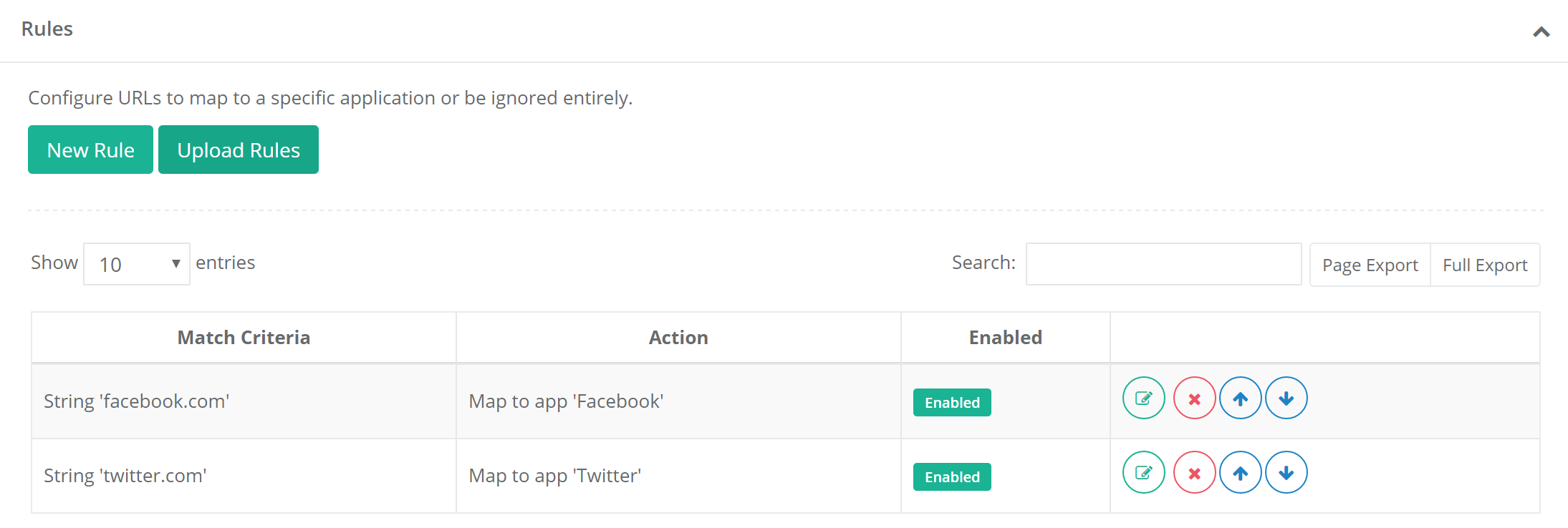 Rules are executed in order that they are listed, from top to bottom. As soon as a rule match is found for a specific web application, that rule takes affect and subsequent rules are ignored. For this reason, you should make sure that the rules are in the correct order; typically, from most specific (at the top) to most general (at the bottom). Use the ‘Move up’ or ‘Move down’ buttons on the rule list to re-order your rules.