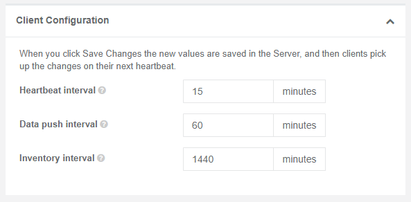Heartbeat interval The interval at which clients poll the server (for new settings, rules, etc.) 15 minutes