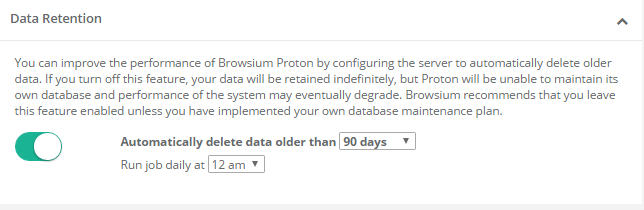 Section titled “Data Retention”BCMS and Proton offer the ability to define data retention policies to support organizational or regulatory compliance requirements, as well as serve to ensure organizations have the ability to limit unbounded growth of the Browsium Proton dataset. The default settings for BCMS are to automatically delete data on a rolling 90-day window, each night at midnight. The values can be adjusted by using the drop-down menu. Alternatively, data retention policies can be entirely disabled by switching the button to the left (off) position.