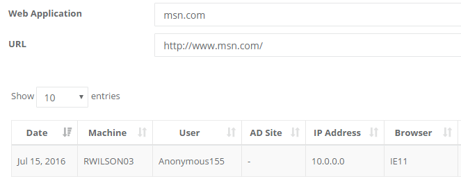 Anonymized activity data will be evident in three fields: User, IP Address, and (optionally) Machine. In the example below, the user who accessed www.msn.com has been anonymized to Anonymous155. (The next anonymized user seen by this Proton server will be Anonymous156.) The IP Address has also been anonymized, zeroing out the last octet. Machine anonymization is not enabled in this example.