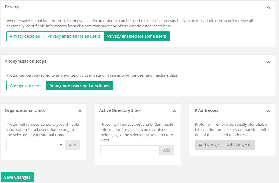 To enable Privacy for all client user accounts, select the ‘Privacy enabled for all users’ button. Then select the scope — either ‘Anonymize users’ to only anonymize usernames and IP addresses, or ‘Anonymize users and machines’ to also anonymize machine names. Then Save Changes to commit the Privacy setting. This will anonymize all client user accounts, IP addresses, and (optionally) machine names for all activity from this point forward. It will not retroactively anonymize any prior activity. If you’ve already collected activity data, it will remain in the database and be visible on reports until that data is purged by the data retention policy settings.