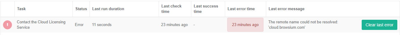 Section titled “Rule mapping As needed, customers can modify and re-sort the Proton rules. When the rule structure is modified, Proton processes the new ordering and re-indexes (as needed) the dataset. This value shows the status and health of that process.”When an error condition occurs, the task switches to status Error. The task will remain in status Error until the task runs again without triggering an error. However, the Last Error Message will remain indefinitely, so BCMS and Proton administrators can see the most recent error, even if status returns to OK**.** The Last Error Message can be cleared from the Diagnostics display via the green “Clear last error” button. However, all errors are written to the Browsium log in Event Viewer so you can retain a copy for future troubleshooting.